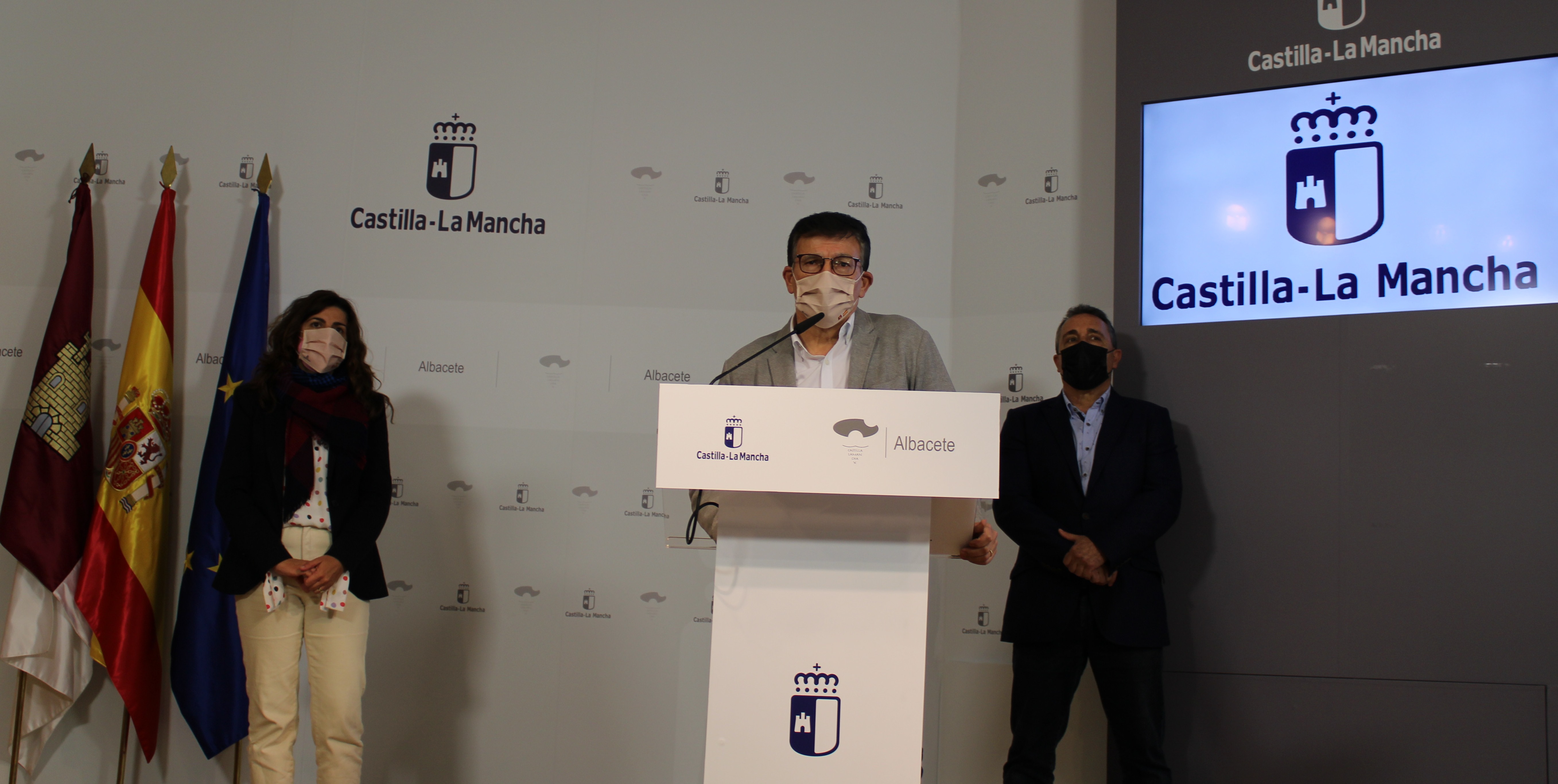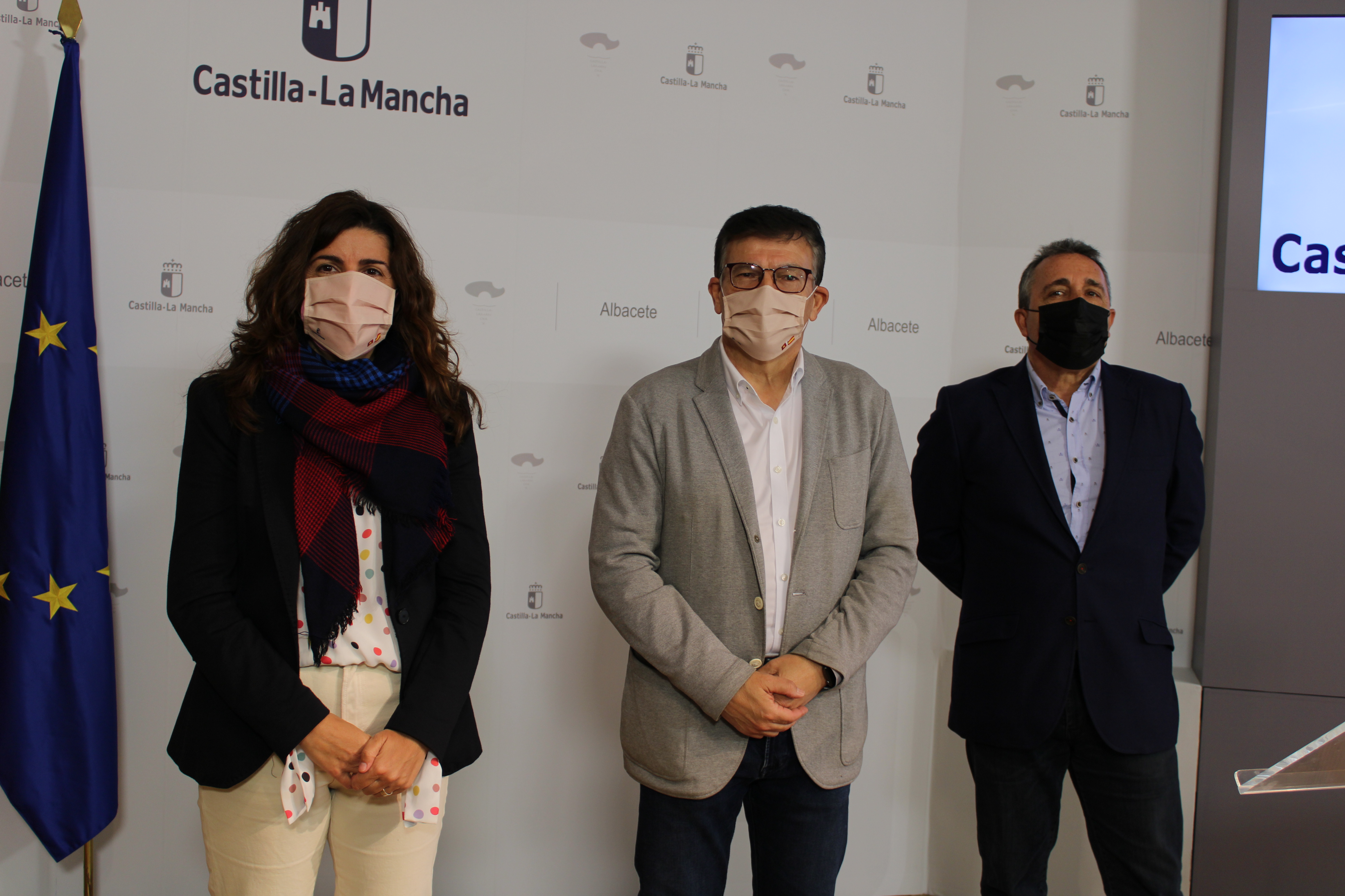 El delegado provincial de Educación, Cultura y Deporte, Diego Pérez junto al coordinador provincial, Andrés Almendros y la jefa del Servicio de Planificación, Nieves Carralero durante la rueda de prensa del Plan de Infraestructuras Educativas 2021 en la provincia de Albacete.