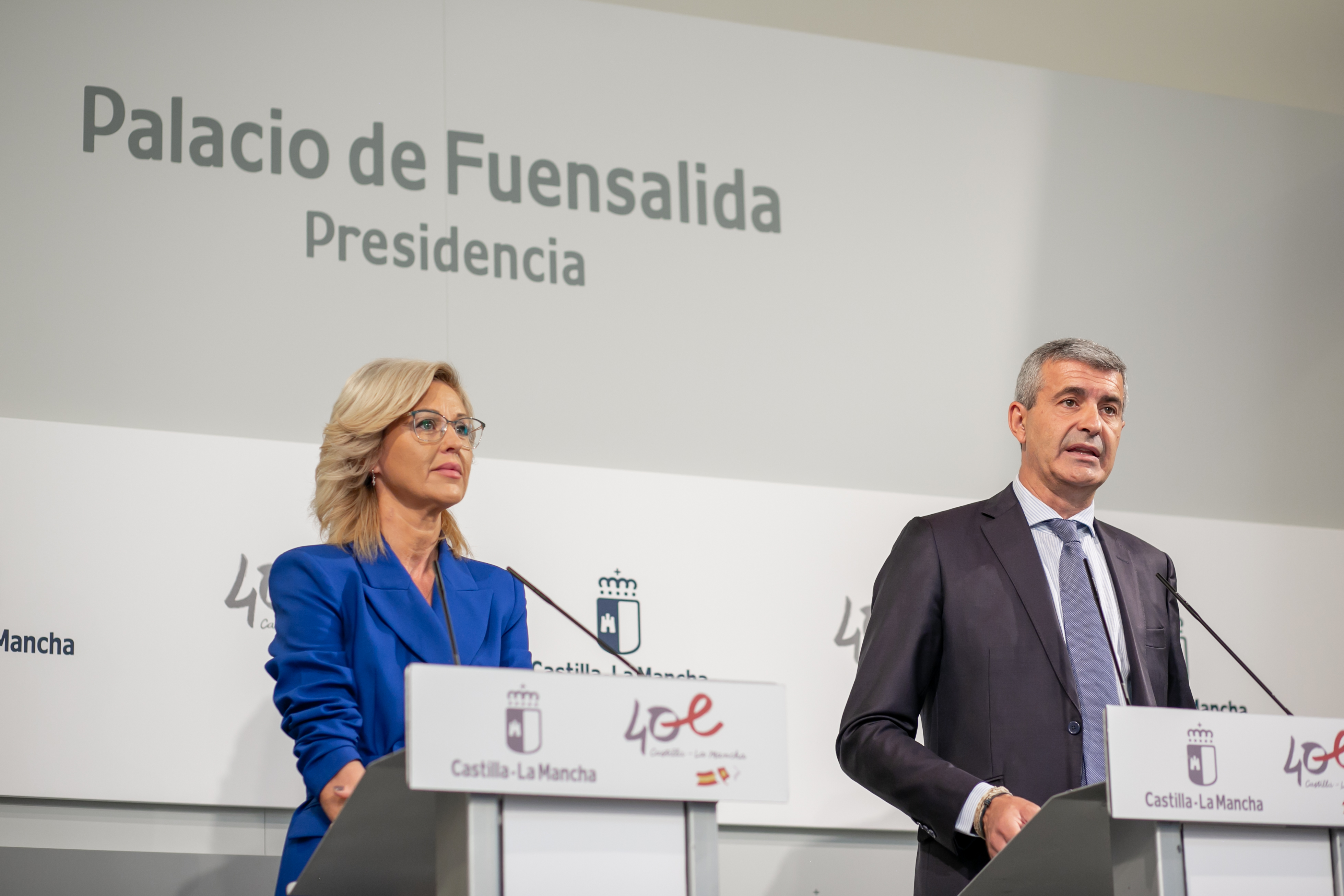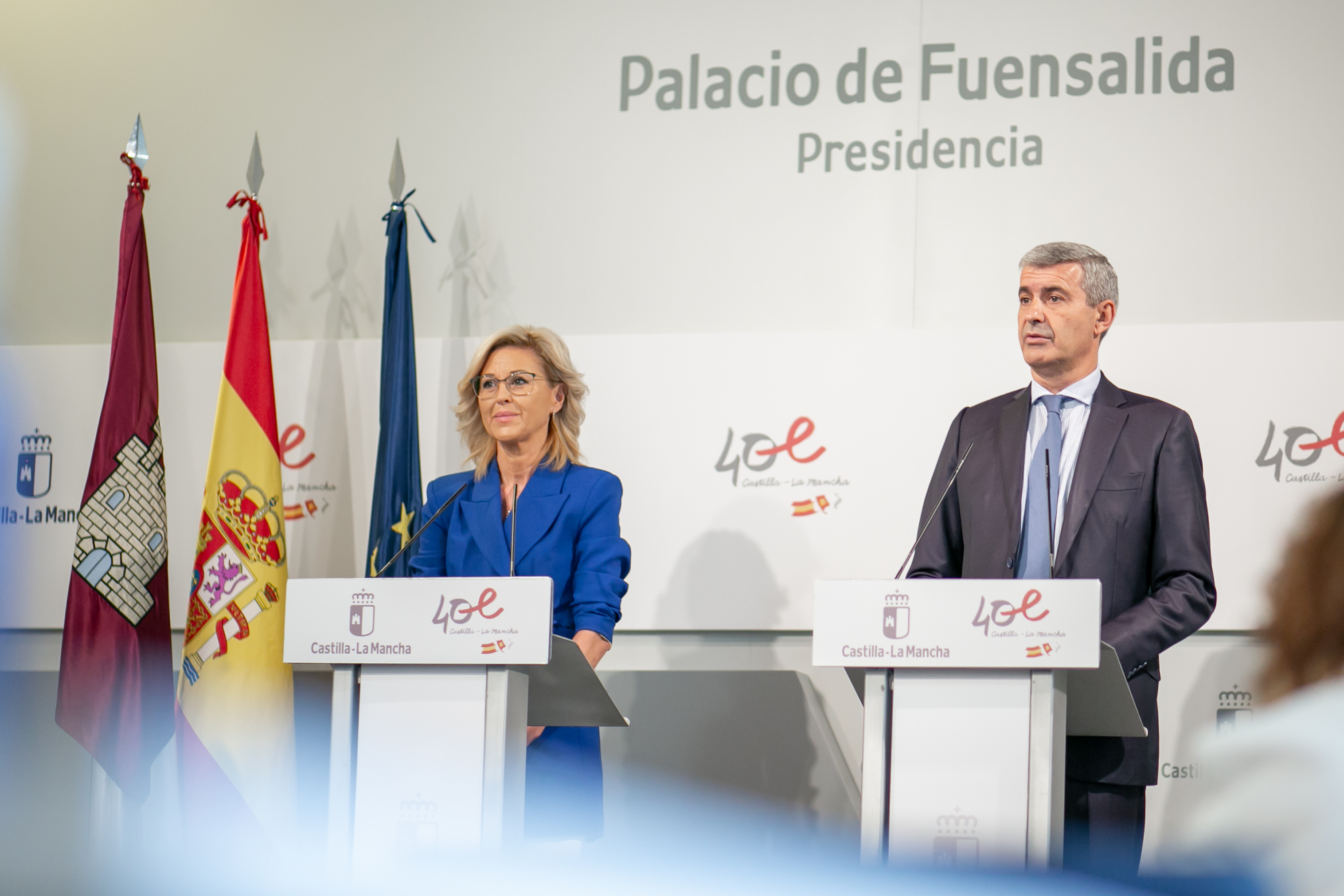 Toledo, 26 de septiembre de 2023.- La delegada de la Junta en Cuenca, María Ángeles López, y el delegado de la Junta en Toledo, Álvaro Gutiérrez, comparecen en rueda de prensa, en el Palacio de Fuensalida, para valorar la declaración de zona catastrófica por parte del Consejo de Ministros de los municipios afectados por la DANA en Castilla-La Mancha. (Fotos: Piedad López // JCCM)