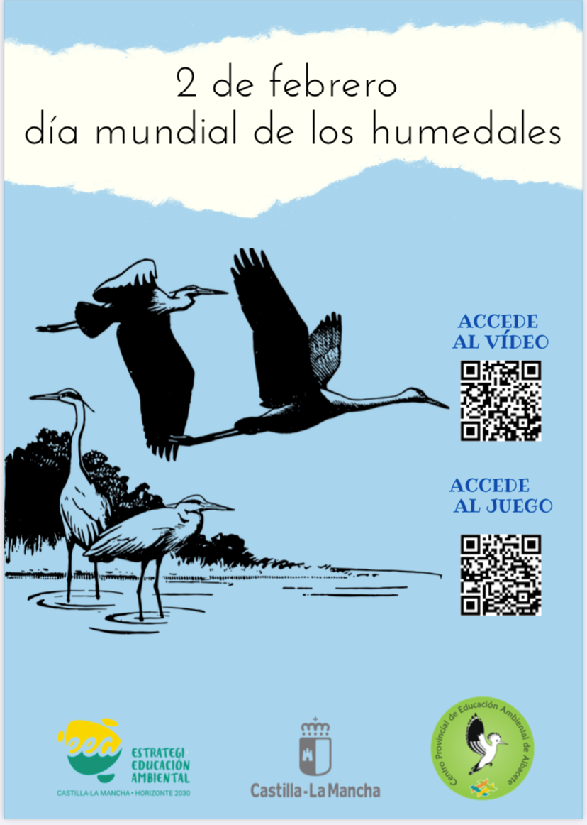 Albacete, 2 de febrero de 2022.- El Centro Provincial de Educación Ambiental de Albacete, dependiente de la Consejería de Desarrollo Sostenible, ha organizado diferentes actividades dirigidas a los centros educativos albaceteños, con motivo del Día Mundial de los Humedales, facilitando un código QR que aparece en el cartel conmemorativo de este 2 de febrero, con el que se podrá acceder a un vídeo didáctico y un juego virtual, especialmente dirigido al alumnado de Educación Infantil.