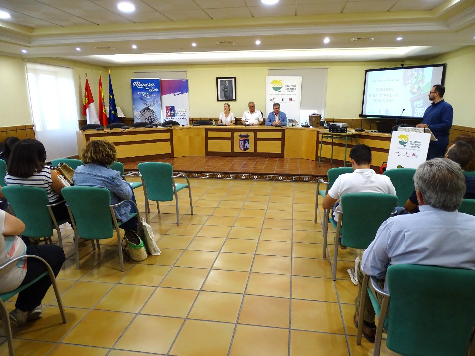 Valero ha estado acompañada por el alcalde de Munera, Desiderio Martínez, y el secretario General de la FEMP, Fermín Cerdán, en un acto que ha reunido a una treintena de personas, entre alcaldes, alcaldesas, concejales, técnicos y responsables de la gestión municipal de los residuos, con el objetivo de ofrecer formación y sensibilización en el correcto uso y gestión de este nuevo contenedor, que se está implantando progresivamente en los municipios de Castilla-La Mancha. En este sentido, los participantes han recordado que en el marrón se deben depositar los desechos orgánicos generados en los hogares, así como los restos de poda de jardinería domiciliaria (biorresiduos), representando aproximadamente el 40 por ciento del total de residuos que se generan en los hogares.