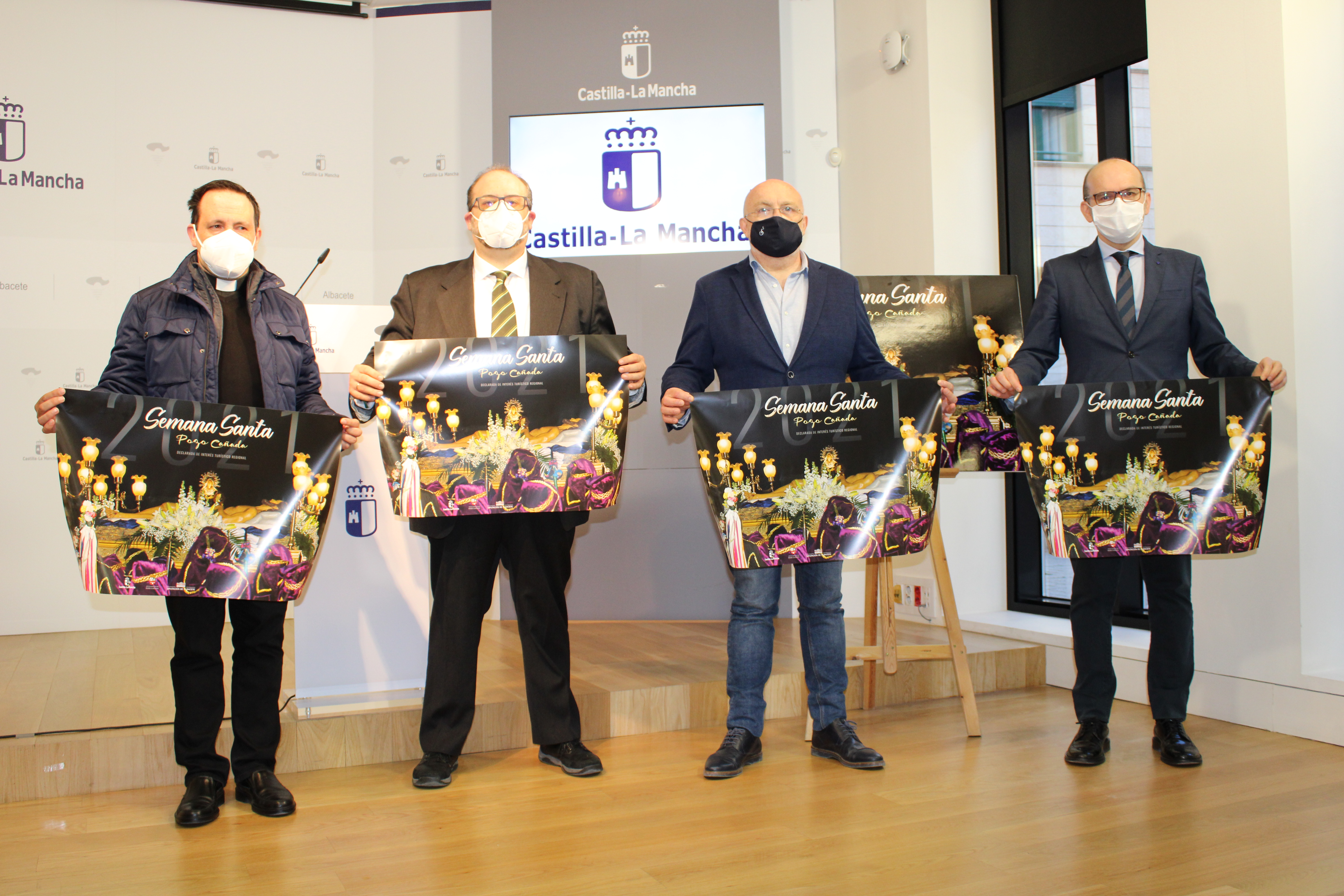 El delegado de la Junta, Pedro Antonio Ruiz Santos; el alcalde de Pozo Cañada, Francisco García Alcaraz; el presidente de la Junta de Cofradías, Juan Soria; y el párroco de la Iglesia "San Juan Bautista", Francisco Callejas, durante la presentación del cartel de la Semana Santa, en la Casa Perona.
