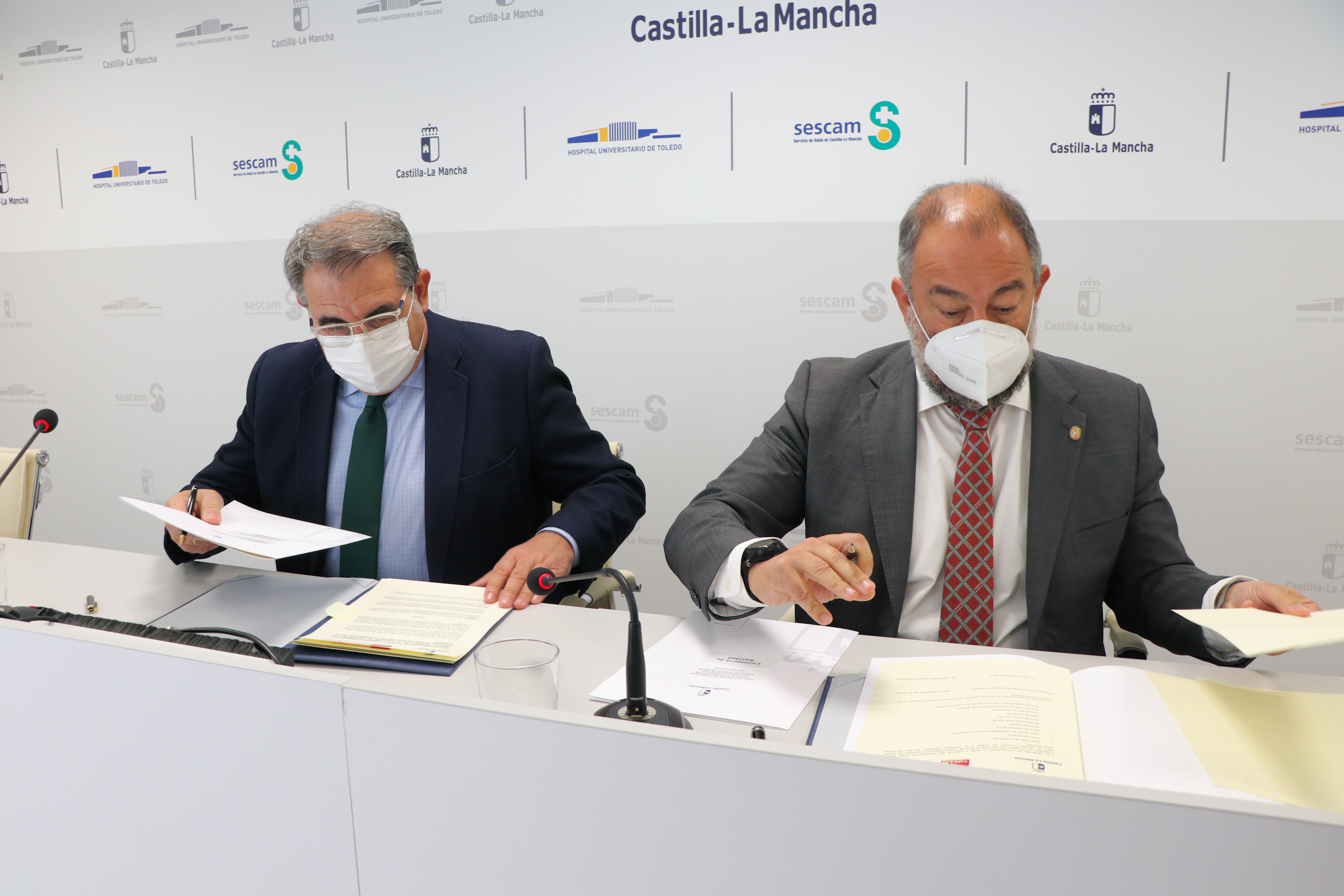 Toledo, 3 de abril de 2023.- El consejero de Sanidad, Jesús Fernández Sanz, y el rector la Universidad de Castilla-La Mancha, José Julián Garde, han suscrito hoy el protocolo de colaboración para la cesión de espacios docentes en el Hospital Universitario de Toledo para los estudiantes de las Facultades de Medicina de Albacete y Ciudad Real que cursarán sus estudios a partir del curso 2023-2024.